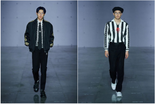为了进一步呈现「二进制」的理念,Kappa的秀场布置赛博未来感十足。秀场空间由三面环幕围合,伴随着电子音乐紧凑的能量输出,模特身着新一季设计踏上 T 台,通过T台模特与三面投影联动,营造出无限循环叠加的震撼视觉效果。整场秀展示了风格各异、不断变化的60余套LOOK,爆款单品接连不断。