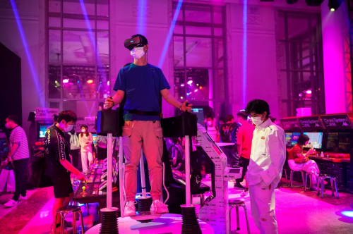 从电音派对涌动的人群中穿梭至 Kappa 游戏厅,嘉宾仿若步入时光穿梭机内,瞬时被传送至童年,又即刻驶向未来。活动限定背靠背 Omini 游戏币启动拳皇格斗街机、跳舞机、太鼓达人、桌上足球、模拟赛车、VR 飞行器、VR 滑雪等项目。各式游戏机奏响记忆中的芯片音乐,大小屏幕光怪陆离,闪烁着赛博图景。