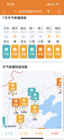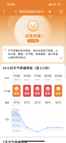 近年来,气候变化对人类健康的影响备受关注,其中,“天气疼痛”就是气候变化直接影响人体健康的一种病症,其症状主要是由于气候变化引发疼痛加剧和其他身体不适。为此,部分医疗机构还专门开设了“天气疼痛・气象病门诊”。作为生活气象服务的探索者,墨迹天气深入研究诱发“天气疼痛”的气候原因并上线「天气疼痛预报」产品,帮助用户提前预防和应对天气疼痛困扰。
