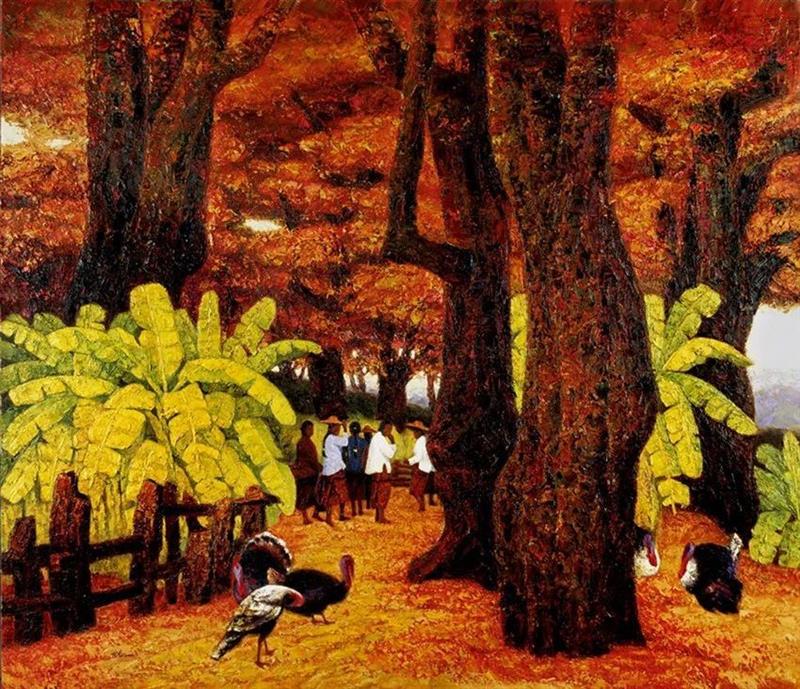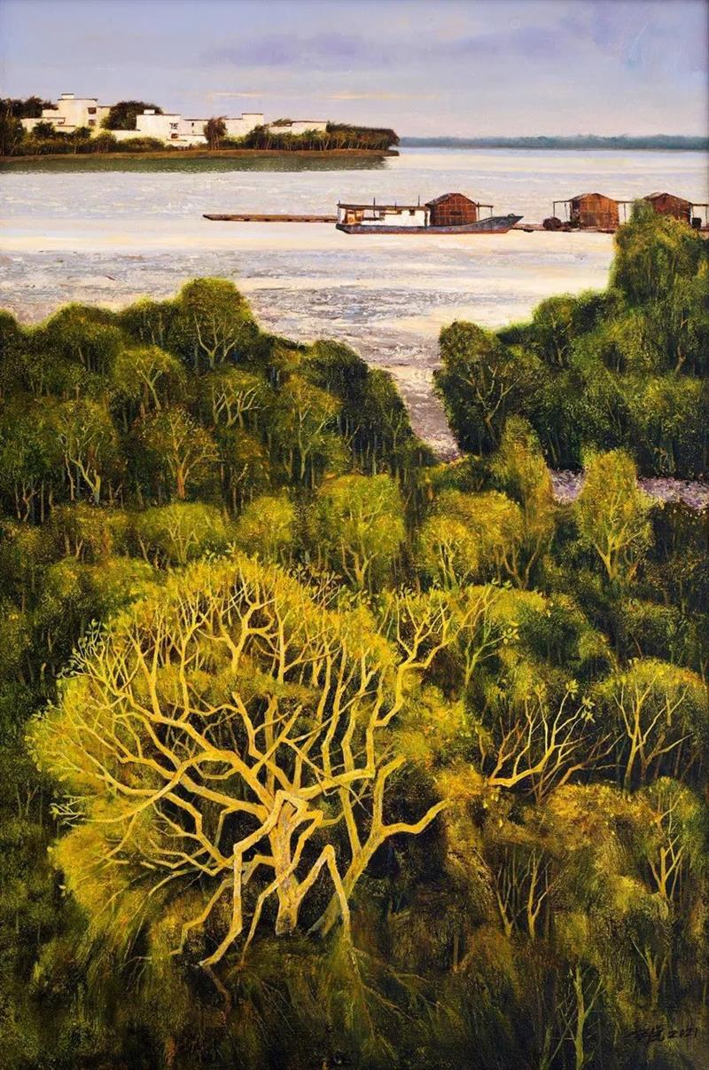 在他创作的《二月的歌》《花开花落》《春天的脚步》《家在对岸》等一系列作品中,以极其热烈真实的色调、准确的造型、飘逸的外在精神,把盘桓天际的榕树,一望无际的芭蕉林,恍如隔世的船型屋,夕阳下归家的牧童,勤劳朴实的黎家汉子,纯真美丽的黎家少女,独具匠心艺术的再现出来。其作品既有传统的审美,又融入当代的美学特质;既尊重海南本土文化,又强调人文和理性精神;作品不但形象纯美、色彩明丽、且又有鲜明的地域特色,突显出油画艺术自身的品格与极富表现的造型功底,体现出东西方文化在作品中的碰撞与交融,把油画本土化、民族化的魅力发挥到极致。充分展示出海南地域文化的一种独特之美,一种热带雨林神秘之美,一种海天一色的宁静之美,一种天人合一的境界之美。