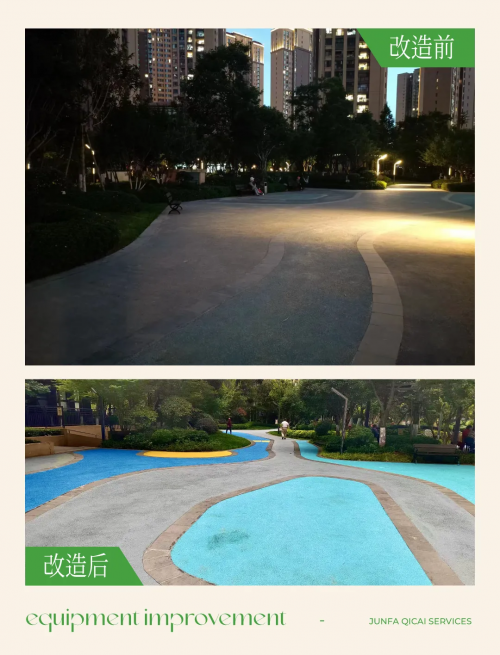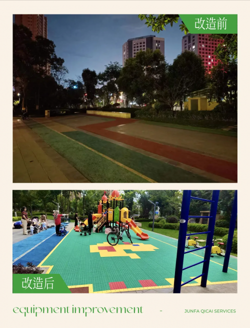 在小区娱乐场,物业团队在发现安全隐患后,迅速进行了翻新改造,计划在六个月内完成所有娱乐设施的翻新工作,以确保孩子们能在一个安全、舒适的环境中玩耍。