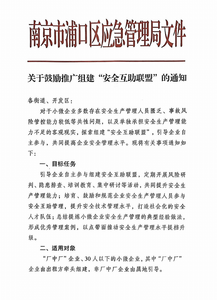 浦口区作为南京市主要工业区之一,2023年10月,浦口区应急管理局率先制定小微企业安全联盟制度,创新探索安全服务联盟和安全互助联盟的“双联盟”模式,通过多主体合作提供安全服务,切实解决小微企业安全管理和监管困境。