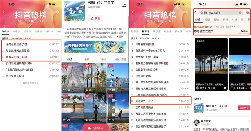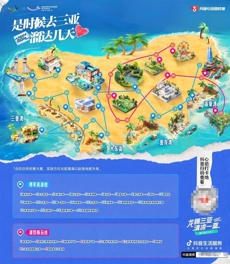 这份包含了三亚本地景区、购物、吃住行游等特色旅游路线的地图,不仅涵盖了崖州古城、海上书屋、天涯小镇、中服免、在内适合年轻人的「青年逐浪线」,还帮助带娃的潮爸潮妈们设计了包括蜈支洲岛、亚特兰蒂斯水世界、海昌梦幻不夜城等在内的「潮娃畅玩线」。无论想要深度探索城市魅力,解锁一个和“刻板印象”里不一样的三亚;还是希望解放双手,带萌娃一起感受热带花鸟鱼虫、全家一起玩沙戏水的快乐,这份短期旅行地图都成为了用户三亚旅行的最佳搭档。两条路线双重惊喜,将全客群的游客夏日假期安排的丰富多彩,前往心动打卡地即可轻松畅游,从而收获三亚夏日心动之旅新体验。全民共创为三亚打Call,心动三亚不止于此打卡三亚的浪漫不止是享受美食美景,用手机记录上传这些精彩美好的瞬间,也激发了本次活动用户的打卡热潮。不同的消费人群、场景及时间节点,都为本次「心动目的地」产出一批又一批优质的短视频内容。用户积极参与发布的有趣好玩的视频内容,引发了包括#是时候去三亚了、#毕业旅行就去三亚等热点话题登上全国同城榜TOP5,同期异地营销热点#跟着花花游三亚、#三亚的海龟游来了广州、#在上海体验三亚海岛风情等热点也分别登上成都、上海、广州的热榜 。心动打卡定格美好,多样化花样安利三亚,令本次活动热度极速扩散,吸引了更多不同圈层的用户关注与参与,帮助三亚高效打造「夏日度假还得去三亚」的城市认知。