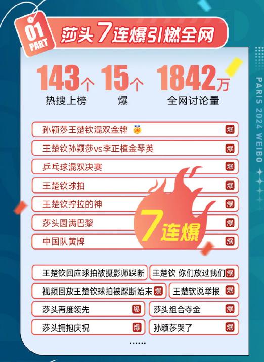 微博热搜爆了!北京时间30日晚,在巴黎奥运会乒乓球混双决赛中,中国组合孙颖莎/王楚钦以4比2战胜朝鲜组合李正植/金琴英获得冠军,此次夺冠迅速在微博掀起讨论热潮!共有143个热搜上榜,#王楚钦孙颖莎VS李正植金琴英#、#孙颖莎王楚钦混双金牌#等连续7个爆款话题登上热搜榜,全网讨论量高达1842万,网友们共同参与和见证了这一惊喜时刻!