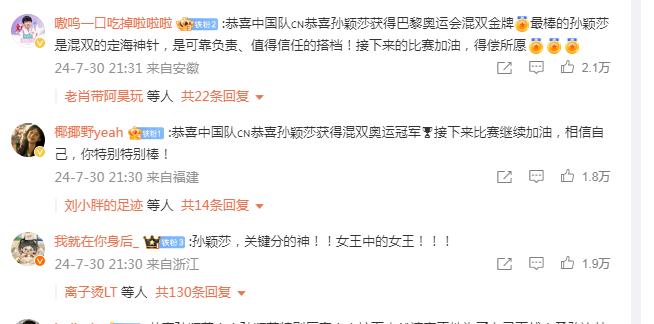 网友们更是纷纷涌入微博,在相关话题评论区表达对这一历史时刻的关注和热情:“恭喜中国队,恭喜孙颖莎获得混双奥运冠军,接下来比赛继续加油,相信自己,你特别特别棒!”“孙颖莎,关键分的神!!女王中的女王!!!”“恭喜王楚钦!恭喜中国队!王楚钦太棒了!!”“收复失地的感觉真好”,“恭喜冠军!”“国球混双,天下无双!”,在微博这个充满活力的讨论社区里,国人对这枚金牌的喜悦与感动一览无余。