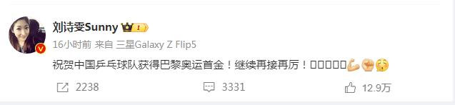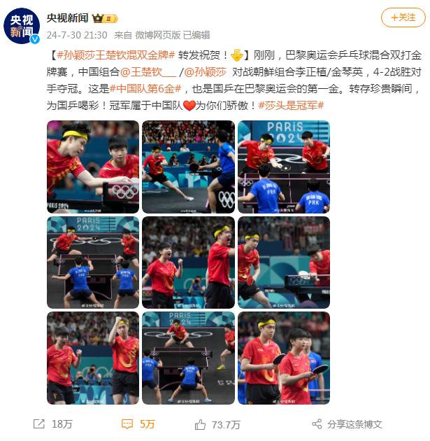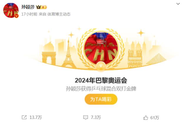 比如此次夺冠后,央视新闻、中国日报、新华网等权威媒体在微博对此次夺冠进行了全面报道,为微博用户带来大量的新鲜谈资;各领域名人大V也纷纷在微博上表示祝贺,如@刘诗雯Sunny发博:“祝贺中国乒乓球队获得巴黎奥运首金!继续再接再厉!”@谢娜发博:“乒乓球爱好者上线,为中国队加油!”@许魏洲ZZ发博:“‘莎头’组合所向披靡!恭喜混双夺冠!!”……这些内容覆盖不同圈层用户,引发各领域人群关注。