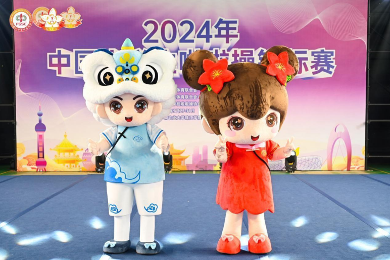 由华珠艺术设计学院师生共同设计的,展现醒狮、木棉花等广东特色元素的2024年中国中学生啦啦操锦标赛吉祥物——粤粤和棉棉,它们也在比赛现场为大家加油助阵。