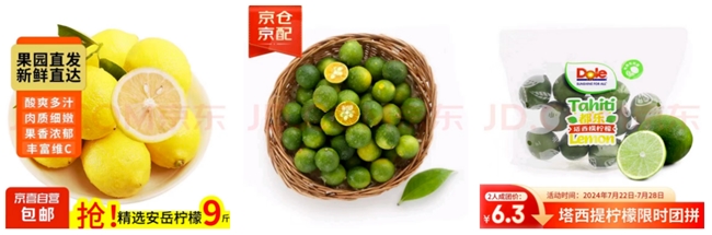 消费者购买柠檬时除了会关注柠檬的种类外,消费者对产地直发、源头直采、新鲜送达等产品产地产区信息的关注度也较高。事实上,在安岳、海南等柠檬主产区,京东采销深入产地,严格筛选农户及产品,通过源头采摘减少中间环节成本,以更短链路,更低价格,将更新鲜的优质柠檬从产地直接送达消费者。观察显示,在京东柠檬热卖榜的TOP 10商品中,有5款安岳黄柠檬,两款海南香水柠檬,两款海南小青柠。