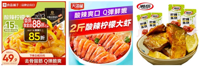 柠檬菜品也成为提升食欲的夏日佳肴,独特的酸味和香气成为开胃菜品的绝佳选择。在“柠檬之乡”四川安岳,当地厨师推出了各种各样以柠檬为原料的菜品,柠香脆皮鱼,柠皮煸肉丝、柠檬鸡豆花、水晶柠檬、柠檬蛋挞、柠檬刺身虾等层出不穷,独特的“柠檬宴”成为安岳乃至四川的一张美食名片。值得关注的是,不少消费者选择购买即食柠檬类食品或快手菜,满足自身或家人的味蕾,其中柠檬捞汁海鲜、柠檬鸡爪、柠檬煎鸡等菜品在夏日里备受欢迎。如在京东上量贩装的柠檬去骨凤爪零食产品在30天内的加购飙升了5倍。