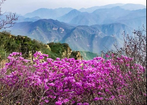 中国是杜鹃花分布最多的国家,约有530余种。杜鹃花又称山踯躅、山石榴、映山红,杜鹃花种类繁多,花色绚丽,花、叶兼美,地栽、盆栽皆宜,是中国十大传统名花之一。传说杜鹃花是由一种鸟吐血染成的。每年三四月份,京东大峡谷景区满山红边,五彩缤纷的杜鹃花唤起了人们对生活热烈美好的感情和对生命的敬畏,它也象征着国家的繁荣富强和人民的幸福生活。
