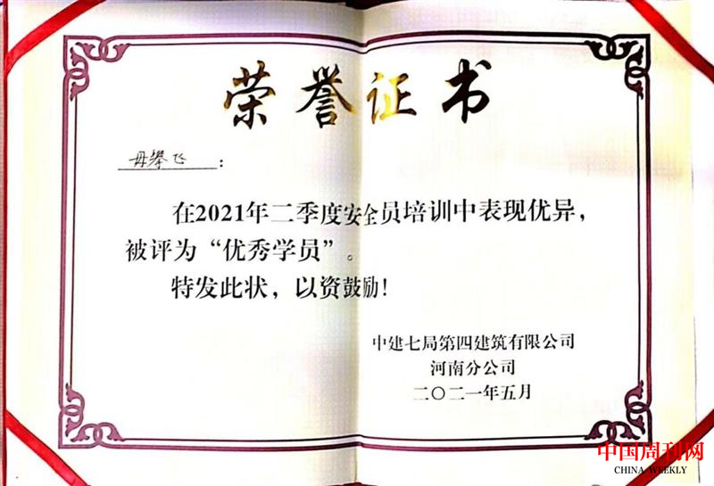 他在项目生产安全隐患排查整改中,采用腾讯在线文档、今日相机管理,实现周检安全隐患上传在线表格、安全隐患在线回复;各劳务分包单位定期回复,项目总包安全员随时随地查看安全隐患整改情况。现场临时用电管理,统一采用航空配电箱。用航空插座代替常规配电箱及插座,杜绝工人私自接电、采用家用排插产生的漏电、触电等安全隐患。开展安全生产标准化建设,积极创建安全生产文明施工标准化示范工地,为项目的安全高效优质建设起到了积极的推动作用。毋攀飞在工作之余,努力提升自己的业务水平,通过了国家一级建造师考试,在国家核心期刊发表多篇论文,取得了多项实用新型发明专利,参建的项目获得了国家优质工程奖,个人也荣获“优秀学员”、“优秀员工”等荣誉。