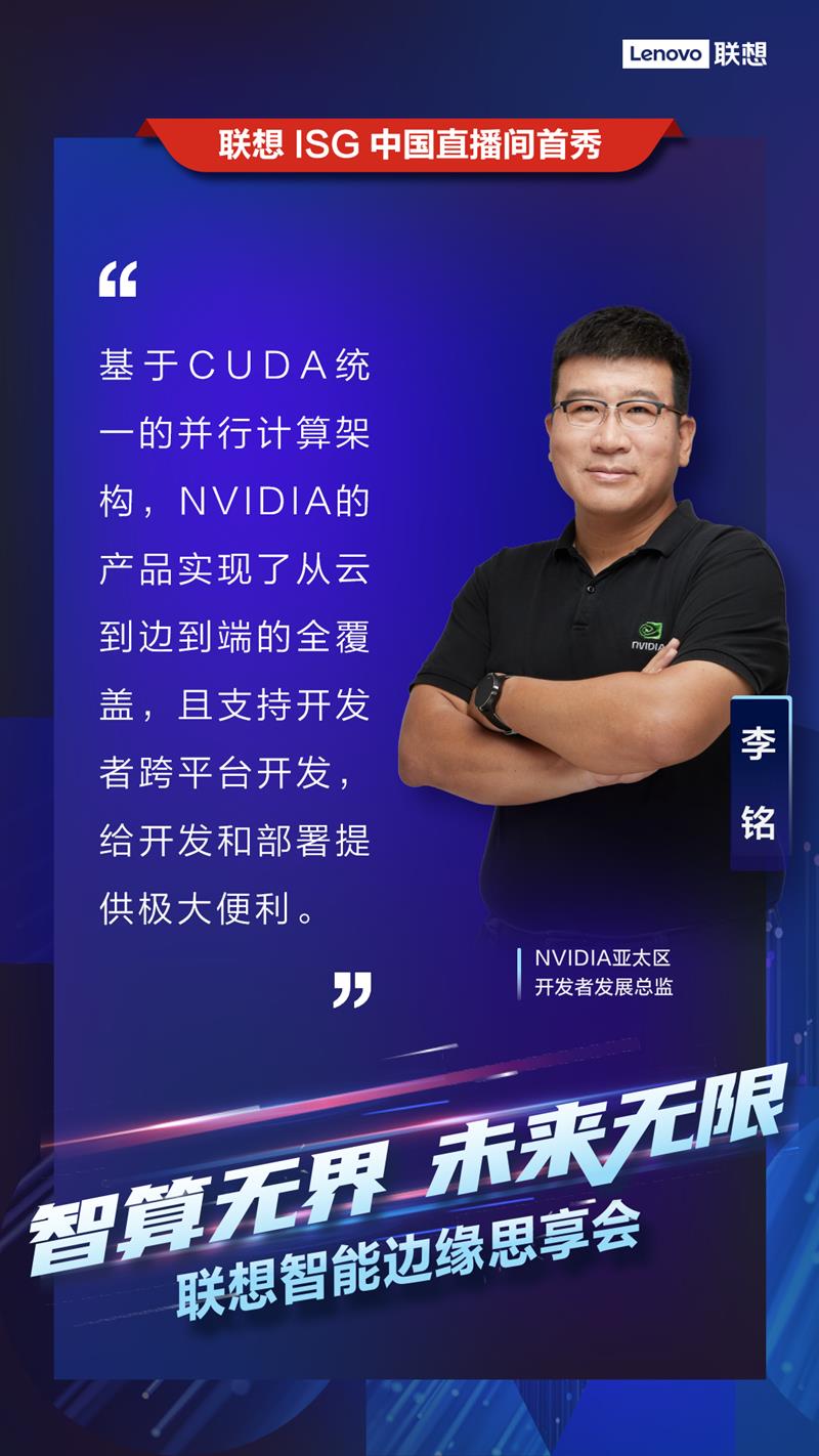 除了自身过硬的科技实力外,联想积极与全球领先的科技公司、算力厂商、软件平台合作伙伴一道,从技术创新、行业洞察等层面深入合作,密切关注客户需求,为中国各行业客户提供端到端的、满足客户边缘计算需求全生命周期的定制化产品与方案。NVIDIA作为联想重要的合伙伙伴,NVIDIA亚太区开发者发展总监李铭博士在此次会议上也分享了其助力人工智能在边缘计算中快速落地的最新实践。