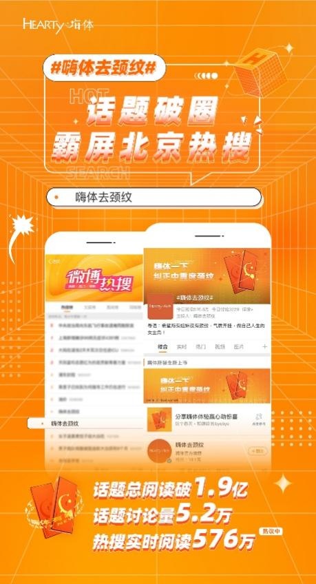 在消费者层面,它通过PGC社会化传播的宣导和科普,为消费者提供专业的医美安全相关知识,让正规医美明确、深入的呈现在大众视野内,帮助他们深入了解正规医美的重要性,并学会辩证和辨真。嗨体联合中整协(行业协会)、权威行业专家、知名医美机构等行业资源和蓝V、知名医美达人一起发起去颈纹科普活动。它先后在微博上发起#注射医美选三类#微博话题,「医美避坑指南—— 揭秘如何养成优雅天鹅颈」科普直播等,其中,在自来水网友的热度加持下,#嗨体去颈纹#话题成功登上热搜。这些话题关注的正是消费者关心的注射医美相关话题,如怎样分辨选用合规、安全的注射类医美,如何避坑无效医美,如何科学去颈纹、嗨体去颈纹的效果和安全性等问题。