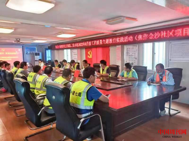(文 常魁星 通讯员 常江龙)8月13日下午,中建七局四公司河南分公司豫北区域项目党支部第三党小组在焦作金沙社区项目部开展了“强化质量意识、聚焦品质提升”工程质量主题教育实践活动,落实党的组织生活制度,抓实党员党性教育,牢记初心使命,永远跟党走,建功新时代,贯彻中建七局加强工程项目质量管理的相关要求和2022年年中工作会议精神,着力让项目员工和劳务工友树牢精品意识,激发干事激情,促进项目优质履约,以优异成绩向党的十二大献礼。项目党员、农民工党员代表、入党积极分子、共青团员、青年员工代表、劳务人员代表参加活动。