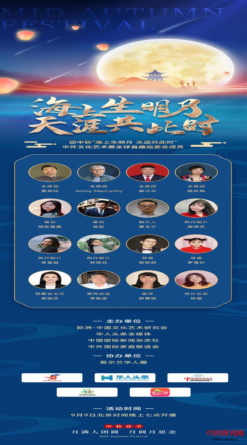 2022迎中秋“海上生明月 天涯共此时”中外艺术展全球直播活动主办单位是:欧洲-中国文化艺术研究会、华人头条全媒体、中国国际新闻杂志社、中外国际家庭联谊会;协办单位是:爱尔兰华人圈。