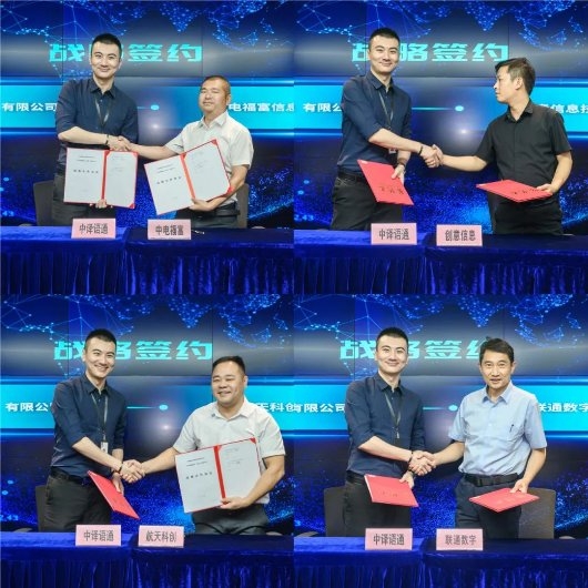 中译语通昆明公司总经理夏朝代表公司分别与中电福富信息科技有限公司、创意信息技术股份有限公司、成都航天科创科技有限公司、联通数字科技有限公司云南省分公司签署了战略合作协议,强强联合、资源整合,为云南业务的开展进一步奠定基础。