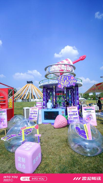 紫粉色碰撞的展台,是INTO YOU品牌在草莓音乐节上给乐迷们的一场别出心裁的体验!这里除了可以拍照打卡之外,也是女孩们的音乐节“秘密变妆”区,这里藏着INTO YOU品牌带给女孩们的“秘密武器”,让现场女孩们可以自在切换妆容,自由打造每一种“人设”: