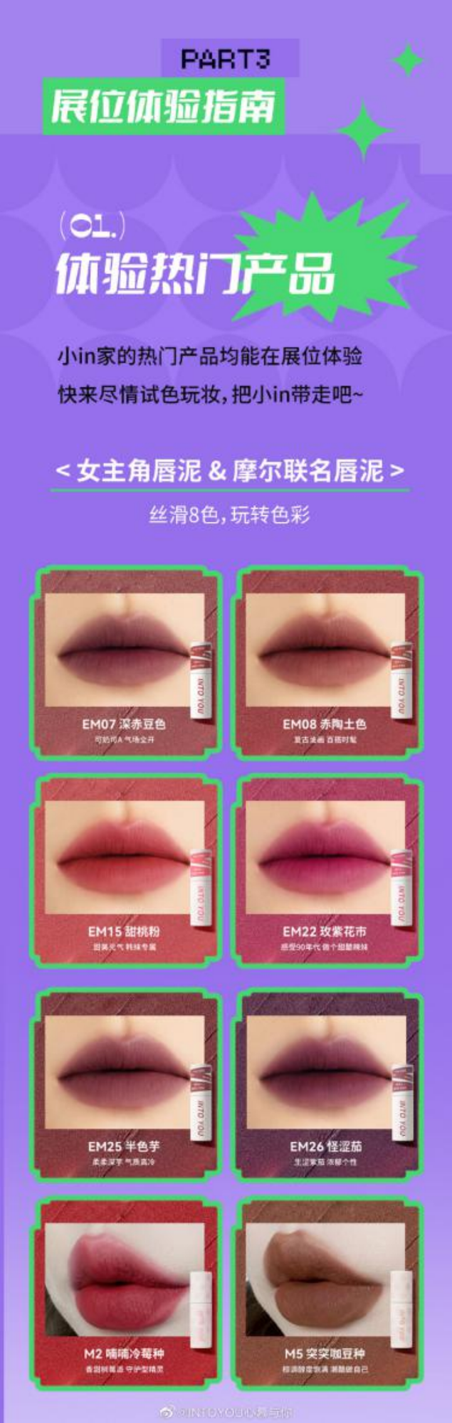 INTO YOU 女主角系列EM07深赤豆色神秘高冷,是音乐节人群中的气场女孩;略带烟熏感的女主角 EM08,豆沙奶咖色轻松打造音乐节人群中的随性女孩;甜妹大多都选择了女主角EM15,在温温柔柔的甜桃粉衬托下,是草莓蜜桃般的邻家女孩;Y2K女孩都偏爱EM22,复古又夸张的玫紫色,涂上立马化身音乐节上引人注目的甜辣女孩;低调又特别的女孩们选择了EM25,清冷的半色芋自带音乐节氛围感;个性女孩哪能“放过”EM26呢,浓郁的怪咖紫打造出潮酷女孩,跟着音乐尽情摇摆……