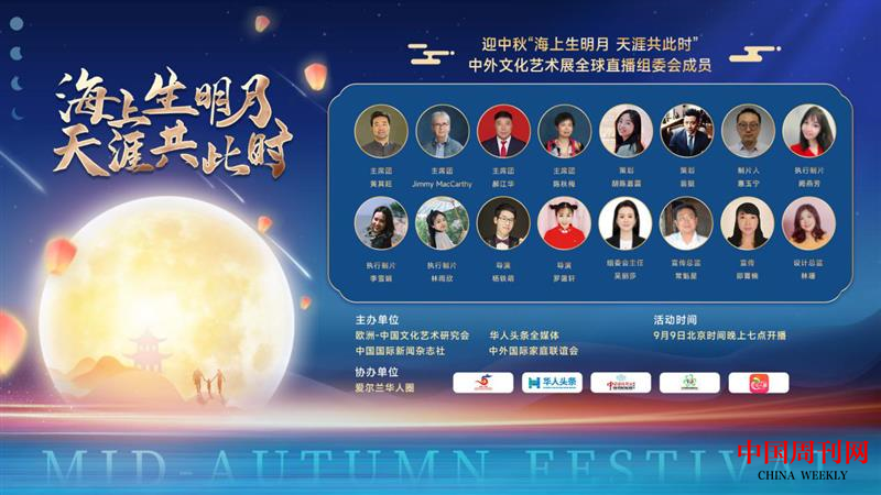 据了解,2022迎中秋“海上生明月 天涯共此时”中外艺术展全球直播活动主办单位是:欧洲-中国文化艺术研究会、华人头条全媒体、中国国际新闻杂志社、中外国际家庭联谊会;协办单位是:爱尔兰华人圈。全球直播活动于9月9日北京时间晚上七点开播。在象征团圆的美好日子,向世界诉说艺术家的情怀,给世界传递艺术家的热情与爱,呼吁世界和平,践行人类命运共同体理念,展示中外艺术家建设人类精神世界的高尚情怀,传播中国传统文化。