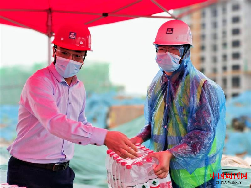 焦作市城乡一体化示范区(高新区)城中村改造指挥部办公室主任郭朝辉,副主任张磊、张琳、丰福生,焦作市示范区城乡投资有限公司副总经理马家海,以及业主方、监理方驻项目现场管理人员和总包方、劳务方管理人员、工友代表50余人参加7号楼封顶仪式。马家海代表业主单位焦作市示范区城乡投资有限公司向项目部赠送了猪肉等慰问礼品。