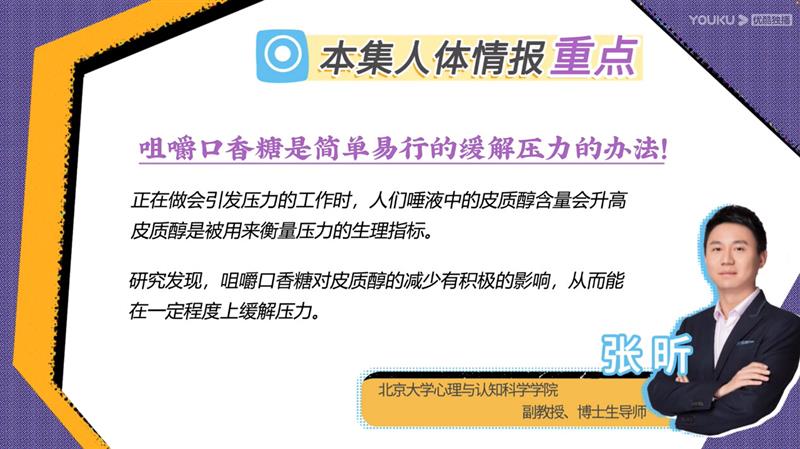 [3] 《咀嚼口香糖对焦虑以及唾液皮质醇含量的影响》·中国临床心理学杂志·北京师范大学许翱翔等人:在做会引发压力的工作时,人们唾液中的皮质醇含 量会升高,皮质醇是一项被用来衡量压力的生理指标。而咀嚼口香糖有助于减少人们唾液中的皮质 醇含量,说明咀嚼口香糖能在一定程度上缓解压力。