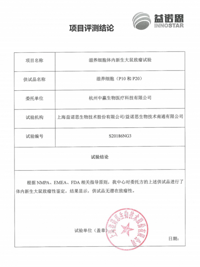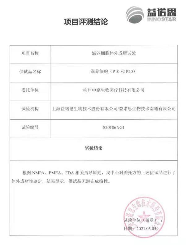 该专利在2021年陆续通过了国家上海新药安评中心关于“滋养细胞体外成瘤性、体内成瘤性和致瘤性”的三项安评试验,试验结果证明了赢生物的专利产品安全、有效。而该产品的突出优势,也让中赢生物抢占了NK细胞赛道领跑席位。
