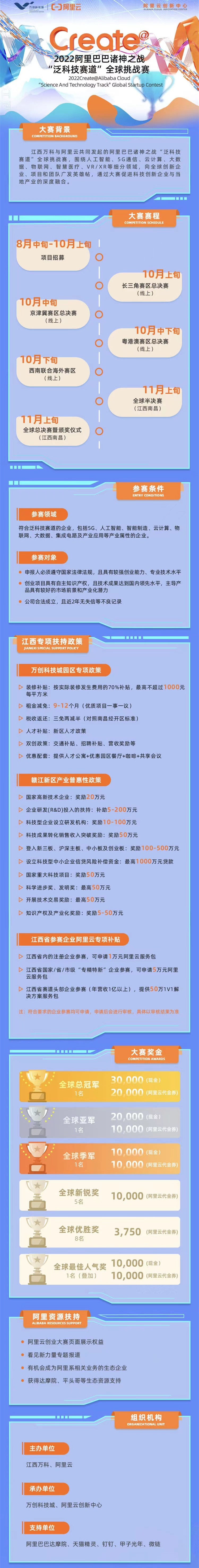本次大赛设冠军、亚军、季军、新锐奖、优胜奖、最佳人气奖,共计六大奖项,设立现金奖励20万元,其中冠军可获得3万元现金及2万元阿里云代金券、亚军可获得2万元现金及1万元阿里云代金券,除现金奖励外,阿里云及江西万科还为参赛企业提供了多项扶持激励。