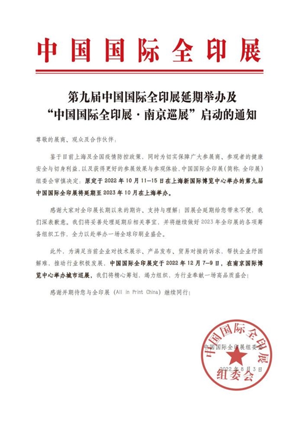 日前,中国国际全印展主办方官宣,鉴于目前上海及全国疫情防控政策,同时为切实保障广大参展商、参观者的健康安全与切身利益,原定于2022年10月11-15日在上海新国际博览中心举办的第九届中国国际全印展将延期至2023年10月在上海举办。并于2022年12月7-9日,在南京国际博览中心首次举办城市巡展。