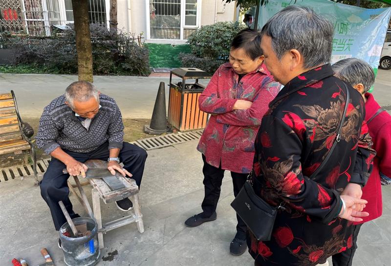 便民服务区,志愿者们依次为居民签到、登记,安排理发、磨刀等服务。磨刀师傅将磨刀装备摆放好后,手中的活儿一刻也没停下来,耐心地磨好每一把刀.磨刀服务深受居民好评。