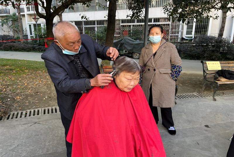 义剪区里,理发师手法熟练,一边给居民们理发,一边聊家常,理完发的居民对着镜子照了照,笑着表示修剪的发型很好,很喜欢,并称赞理发师心灵手巧。