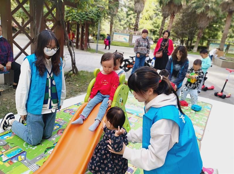 低幼龄儿童玩乐区里的小宝贝们,在家长们的引导下,有序地排队玩耍滑滑板和走平衡木。一位家长表示家园义集是自己孩子非常惦记的活动,因为可以和其他小朋友一起走平衡木,家长们也非常愿意带孩子来参与,从活动中可以让孩子和其他孩子互动,锻炼人际交流能力。
