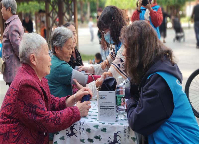 健康服务区,长者们享受志愿者们的爱心服务,测量血压、节气养生等等服务非常受长者们的欢迎。有的长者测完血压,还会和志愿者聊上几句,舒缓心情,排解寂寞。