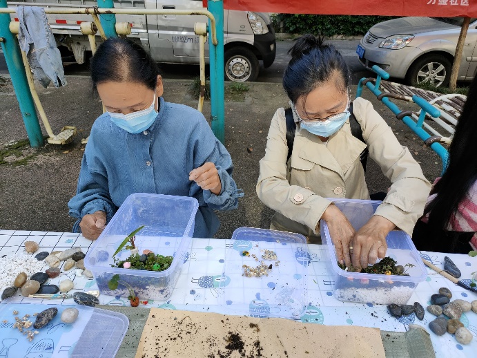 一花一世界,一木一浮生。微景观将每个人心中的理想和美好、童真和无暇呈现出来。活动吸引了成年居民4位报名参与, “这太治愈了,感觉有很多想法想加进去”,现场沉浸式创作,也带给居民们无限美好感受。在分享环节每组家庭轮流介绍了自己的作品“mini动物乐园”、“童话镇”、“美丽田园”“海洋乐园”等,现场招募了2组家庭和4位居民加入小区志愿服务队。