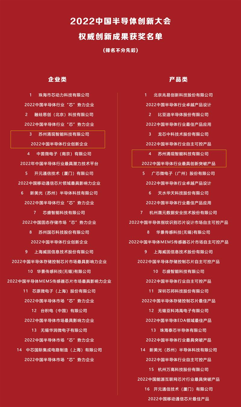 2022中国半导体创新大会中,中国电子商会公布了企业和产品两个维度的创新奖,涌现科技经过2个多月的严格评审与激烈角逐,获评“2022中国半导体行业创新企业”、“2022中国半导体行业最具创新突破产品”两项荣誉。