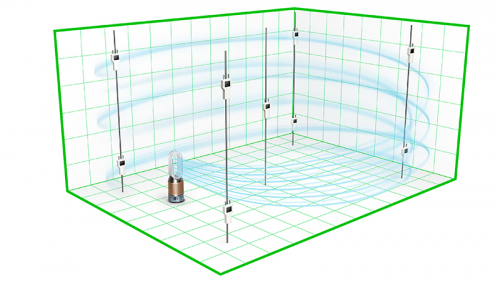 相比于传统测试,戴森工程师精益求精,在更接近平均居住空间的一个81立方米的实验室内开展POLAR测试。在不安装附加混流风扇的情况下,将空气净化设备放置在一角,并采用9个传感器持续监测整屋的空气质量数据,评估空气净化设备的过滤表现、传感性能以及整屋均匀净化效果。这一测试能够全面、有效地保障真实家庭环境中整屋空气质量的洁净与健康。