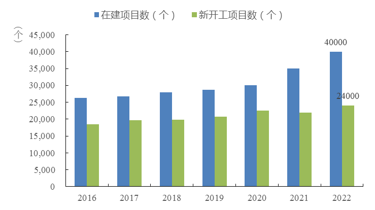 图4 2016-2022年全国水利新开工项目和在建项目数量