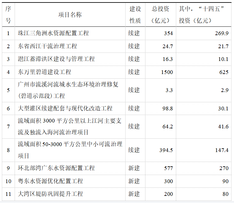 表1 广东省“十四五”重点项目投资汇总表