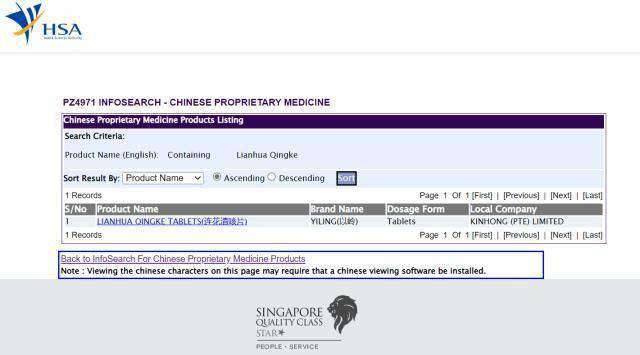 图为新加坡卫生科学局官方网站上的连花清咳片注册查询结果。