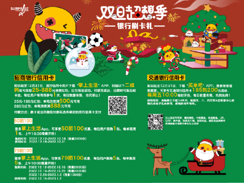 双旦超想季期间,斯普瑞斯奥莱开展会员十倍积分、积分抵现、新会员开卡礼等多重促销活动;除此之外,斯普瑞斯奥莱联合多家银行,为大家送上更多福利。即日起在招商银行“掌上生活”app可享50团100和79团100等活动,交通银行信用卡可享185团200等活动。叠加使用,优惠翻倍,让消费者体会到更多的惊喜折扣,千万不要错过!