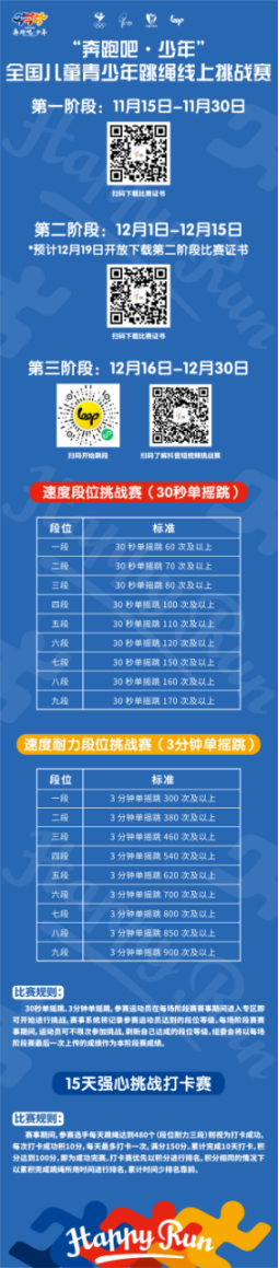为贯彻落实《全民健身计划(2021-2025年)》,推进体教融合,广泛推动儿童青少年积极参与跳绳活动,提高健康水平,在国家体育总局青少司的指导下,国家体育总局社会体育指导中心、全民健身活动推广与指导委员会、全国跳绳推广委员会联合举办 “奔跑吧·少年”全国儿童青少年跳绳线上挑战赛于11月15日-12月30日举行。