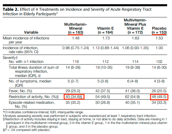 全球四大顶级医学期刊之一的《美国医学会杂志》(The Journal of the American Medical Association, JAMA)曾刊登文章,一项针对652例60岁及以上老年人的干预研究显示,当上呼吸道感染后,服用复合维生素矿物质的人群中自我报告行动受限的比例为34.8%。而不服用复合维生素矿物质的人群行动受限的比例则接近50%。