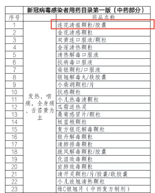 此版用药目录按照中西药分开的原则,是对国家第九版诊疗方案中推荐用药的完善和补充,针对发热、咽痛等6类中医诊断症状推荐使用连花清瘟胶囊/颗粒在内的67个中药品种。