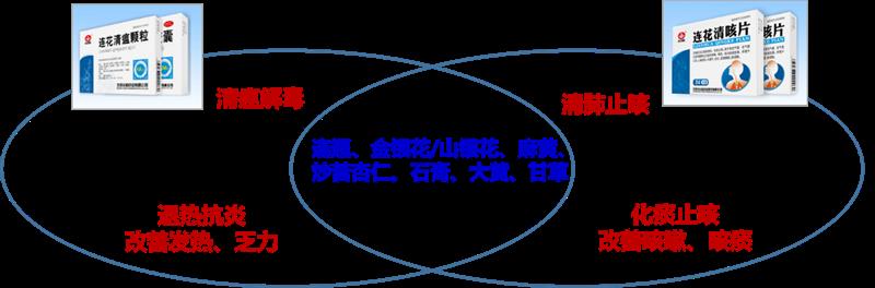 其中,连花清瘟以东汉张仲景《伤寒杂病论》麻杏石甘汤与清代吴鞠通《温病条辨》银翘散为基础方,汲取明代吴又可《温疫论》治疫病用大黄的用药经验。而连花清咳片融汇了东汉张仲景麻杏石甘汤宣肺泄热,明代叶文玲清金化痰汤清泄肺热、化痰止咳,配伍山银花、连翘、牛蒡子清热解毒,大黄通腑泄肺,具有“宣肺泄热、止咳化痰”的功效。