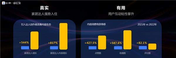 在了解了用户需求在不断变化后,住小帮在2022年持续通过“大投入、大发展、成体系”对平台内容画风进行升级。围绕着“专业、真实、有用”的新画风愿景,住小帮首先在专业性上构建了家装行业的内容知识图谱,帮助设计师、达人加深对内容生态及用户需求的理解及满足。其次在内容真实性上,住小帮通过「家新计划」,以544%的增速引入家居达人,促进平台内容生态向着更真实的方向改善,从大幅度增长的互动反馈中也可以看到,这些真实内容对于用户来说是有用的。