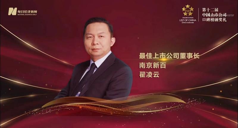 2022年12月28日,每日经济新闻主办的“第十一届中国上市公司高峰论坛”系列活动隆重举行,活动中,中国资本市场年度荣誉盛典——“2022第十二届中国上市公司口碑榜”重磅发布。南京新百董事长翟凌云凭借卓越创新力和领导力荣获“2022第十二届中国上市公司口碑榜”之“最佳上市公司董事长”奖项。
