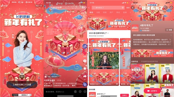 具体来看,飞鹤紧随用户节庆习惯的变迁,首先沿袭了过去两年的“群星春节大拜年”活动,与巨量引擎 x 抖音娱乐共同发起“新年有礼了”话题挑战赛,联动姜潮、麦迪娜、朱嘉琦、李紫婷、郑乃馨等360位站内明星送出新春祝福,掀起兔年新春拜年热潮,在这一过程中,高频露出的飞鹤品牌无疑是借势明星影响力实现了高效曝光。
