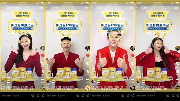 例如在孙怡、曾舜晞、傅菁、林柏叡的联动短视频内容中,明星与飞鹤奶粉品牌共同发起飞鹤奶粉鲜萃活性营养兔子手势舞,打开粉丝的自发性传播渠道,不仅在抖音平台引领拜年热潮实现品牌信息的不断露出,也随之成为其余参与活动品牌争相跟随的方向。