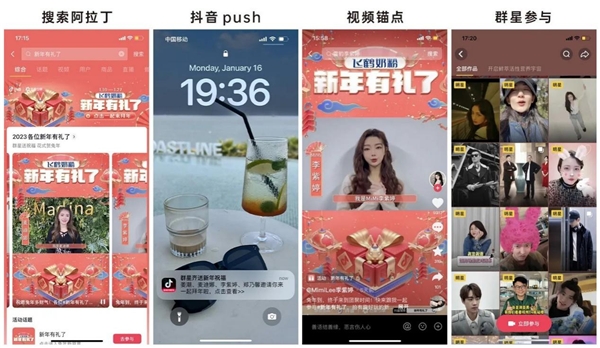 「群星大拜年」模块作为巨量引擎携手抖音娱乐升级的春节营销活动闪耀亮点之一,相较于前两届「新年有礼了」的明星助阵数量及咖位,具有量与质的double提升,基本实现全明星打call阵容。活动期间,抖音娱乐通过合作360位明星拍摄新春贺岁视频,号召网友参与,用更适配春节氛围的视觉标签,来放大飞鹤奶粉在春节节点上的品牌关怀声量。