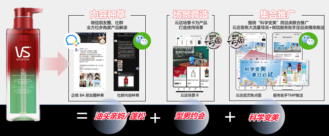 油性发质人群在屈臣氏会看到“油头亲妈”、“蓬松小绿瓶”、“高颅顶”等有趣文案,同时风格也更适应朋友圈的私密人际交流语境。而面对男性,该洗发水则会和其他香水、洗面奶等一起构成“型男约会秘籍”“帅气出门,一型到底”,帮助不那么爱逛街的男性降低选择成本。同时,屈臣氏还通过“科学变美”等主题,进一步提升沙宣原有的“沙龙专研”的品牌印象,不仅能触动更多不同类型的新顾客,也更有可能加深运营原有的客群。