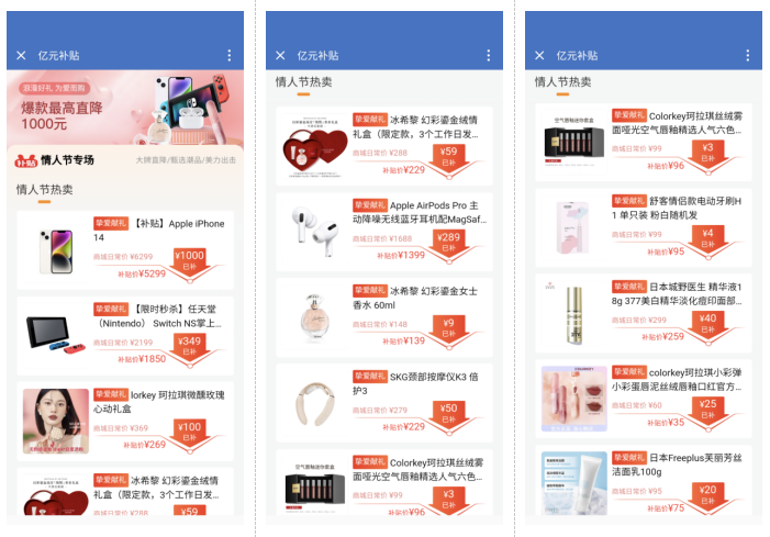 此外,省呗也特别在省呗商城推出了补贴专场,大牌美妆数码等品类均有补贴奉上,最高直降1000元,助力年轻用户更好地度过情人节。